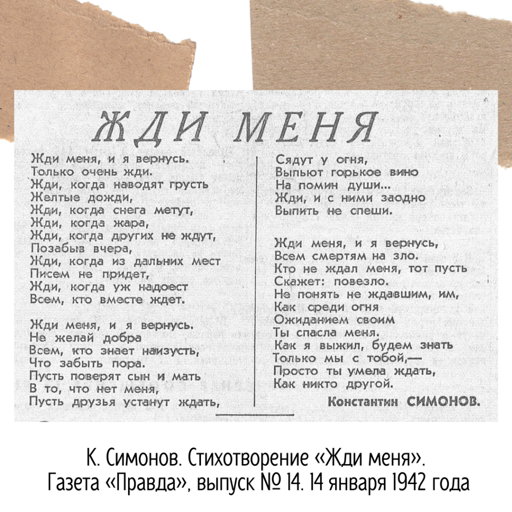 Не было бойца, который не знал стихотворение “Жди меня”. Солдаты вырезали стихи из газет, переписывали, сидя в окопах, заучивали наизусть и посылали в письмах женам и невестам. Стихотворения находили в нагрудных карманах раненых и убитых.