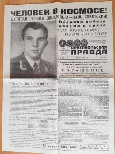 Вместе с «Комсомольской правдой» вспоминаем памятный день — 12 апреля 1961 года. Газета целиком посвятила свой номер историческому событию — первому полету человека в космос, она повествует о свершившемся событии с искренним восторгом и гордостью. Заголовки славили подвиг советского народа «Мир рукоплещет Юрию Гагарину!», «Великая победа разума и труда!», «Капитан первого звездолета — наш, советский!». В номере опубликованы сердечные поздравления от центрального комитета КПСС, Совета министров СССР всем ученым, инженерам, техникам, коллективам и организациям, которые принимали участие в осуществлении первого космического полета, а рядом горячие слова от самых разных людей – народных артистов, рабочих, курсантов училищ, композиторов, Героев Советского Союза. «Мир потрясен! Гагарин — Колумб космоса!», «Грандиозно!» — под такими заголовками делятся своими чувствами люди из разных стран планеты. Четвертая полоса посвящена репортажу из дома первого космонавта. Здесь фотография его жены Валентины, сделанная в тот момент, когда ей сообщили, что дана команда на приземление. Можно только представить, какие чувства она испытывала. Есть и небольшое интервью от отца Юрия Гагарина, Алексея Ивановича, который рассказывает, что сын с детства был увлечен небом.