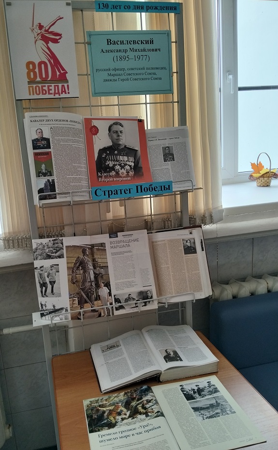 Более подробная информация о его жизни, карьере и вкладе в победу в Великой Отечественной войне на выставке литературы «Стратег Победы».