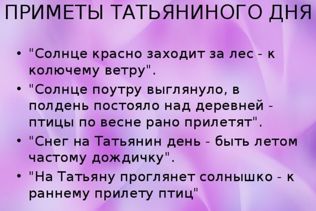 В народе это день называют днем Татьяны Крещенской. В суровое морозное время она не оставит вниманием и своих друзей, домочадцев. Она милосердна, сумеет утешить, успокоить – скоро закончится холодная зима и придет долгожданное тепло.