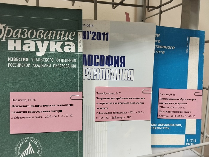 • Васягина, Н. Н. Психолого-педагогическая технология развития самосознания матери / Н. Н. Васягина. - Текст : непосредственный // Образование и наука. Изв. Урал. отд. РАО. - 2010. - № 1. - С. 23-30. - Библиогр.: с. 29-30.