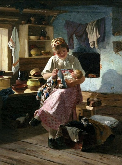 Художники разных эпох и стилей раскрывали тему материнства и труда, подчеркивая важность роли женщин в обществе и их способность совмещать различные аспекты жизни. В них запечатлены моменты, полные любви, заботы и трудолюбия. Так мы видим сильных и крепких духом женщин, прекрасно совмещающих воспитание детей с обыденными делами.