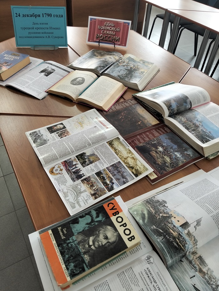 В читальном зале организована выставка литературы "День взятия турецкой крепости Измаил русскими войсками под командованием А.В. Суворова". Приглашаем читателей познакомиться с историческими событиями и личностью выдающегося полководца. Представленный материал несет в себе не только не только образовательную функцию, но и помогает сохранить память о героическом прошлом России.