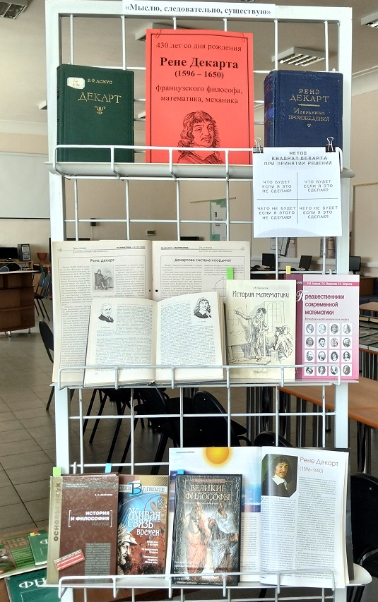 В читальном зале библиотеки ШГПУ организована выставка литературы «Я мыслю, следовательно, существую», где посетители могут ознакомиться с биографическими изданиями, посвящёнными жизни Рене Декарта, а также с его философскими и математическими трудами. В экспозиции представлены работы, раскрывающие вклад Декарта в развитие аналитической геометрии, его знаменитый метод познания и рационалистическую философию. Его идеи сформировали основы современного научного мировоззрения и продолжают оставаться актуальными.