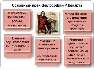Философия Декарта была дуалистической: дуализм души и тела, — то есть двойственность идеального и материального.